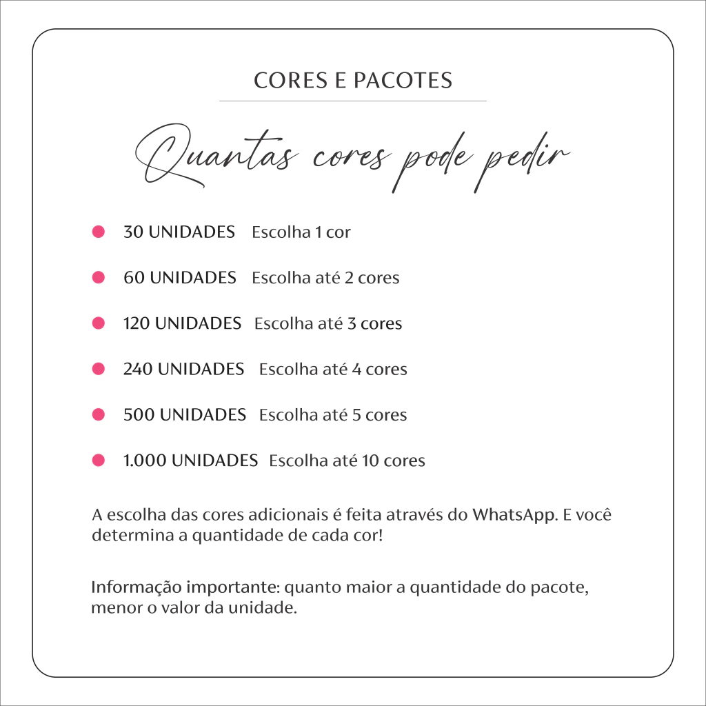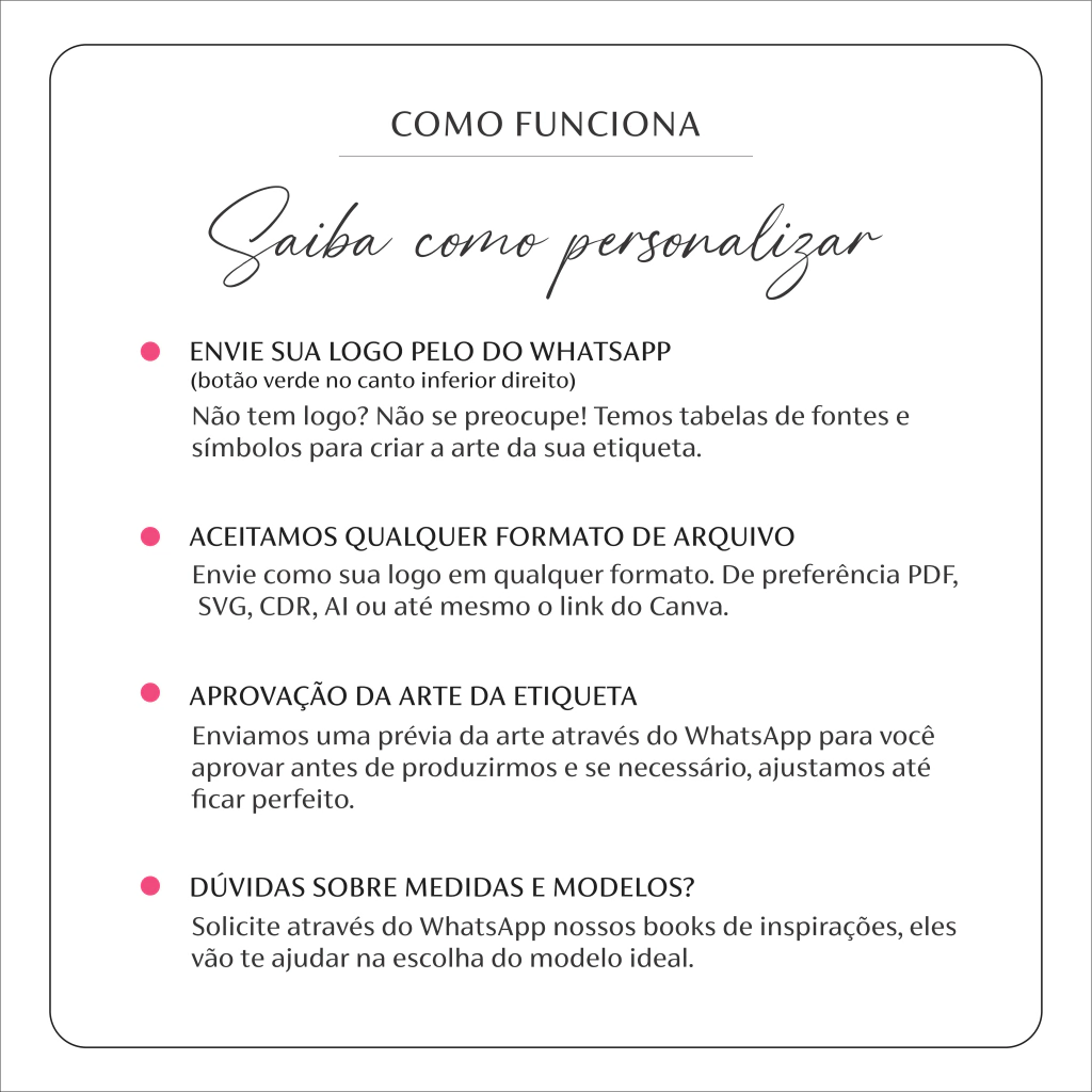 Após a confirmação do pedido, entraremos em contato com você pelo WhatsApp em um prazo máximo de 1 dia útil para alinhar todos os detalhes. Caso já tenha um logotipo, iremos utilizá-lo para criar o layout da sua etiqueta. Se não tiver, podemos sugerir fontes e símbolos para personalização.